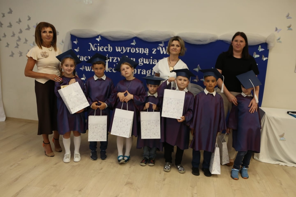 06.06.2025 r. w grupie III i VI odbyło się uroczyste zakończenie przedszkola. Dzieci zaprezentowały okolicznościowy program artystyczny. W przygotowanie uroczystości starszaki włożyły wiele pracy, a wszyscy obecni rodzice docenili ich trud gromkimi brawami. Po części artystycznej Pani Dyrektor pożegnała wychowanków życząc dzieciom wielu sukcesów w szkole oraz wręczając upominki.